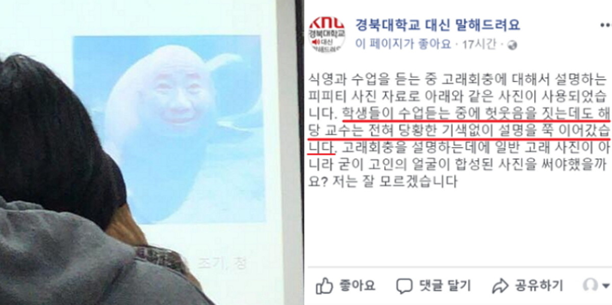 [인사이트] 김한솔 기자 = 경북대학교 강의에 고(故) 노무현 전 대통령과 고래를 합성한 '비하 사진'이 수업 자료로 사용돼 논란이 되고 있다.