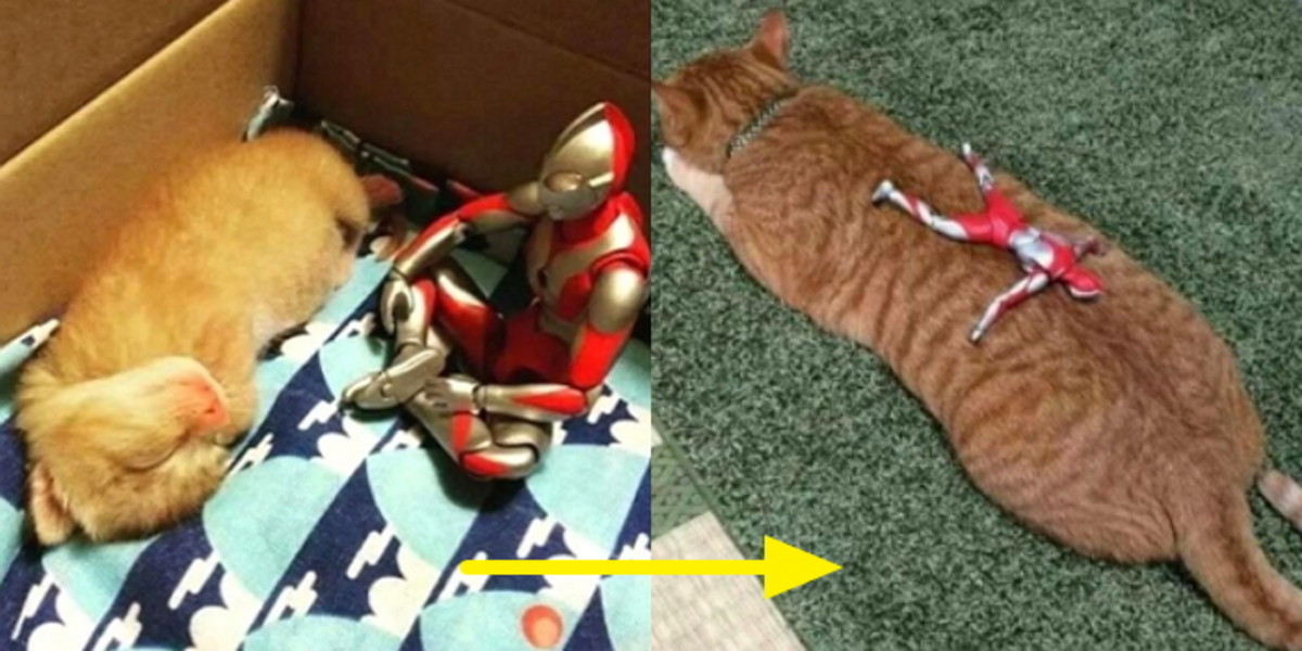 집에 돌아온 집사는 언제 떠날지 모르는 아기 고양이가 외롭지 않도록 친구를 만들어줬다. 바로 자신과 크기가 비슷한 '울트라맨' 친구였다.