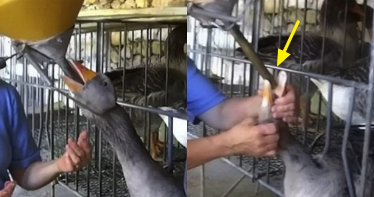 그 다음엔 두꺼운 쇠 깔대기가 등장한다. 여성은 거위의 입을 억지로 벌려 쇠 깔때기를 거위 목 깊숙이 집어넣는다.