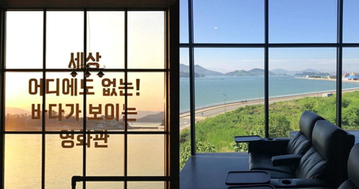 해당 영화관은 경상남도 사천시 해안관광로에 위치한 '메가박스 삼천포점'으로 공간 한쪽 면이 '통유리'로 된 이색 영화관이다.