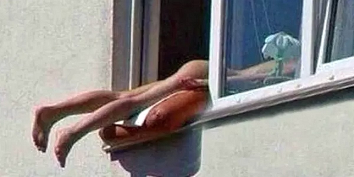 여성은 창문턱에 매트리스를 비스듬히 걸쳐놓은 상태에서 완전 누드 상태로 선탠을 즐겼다.