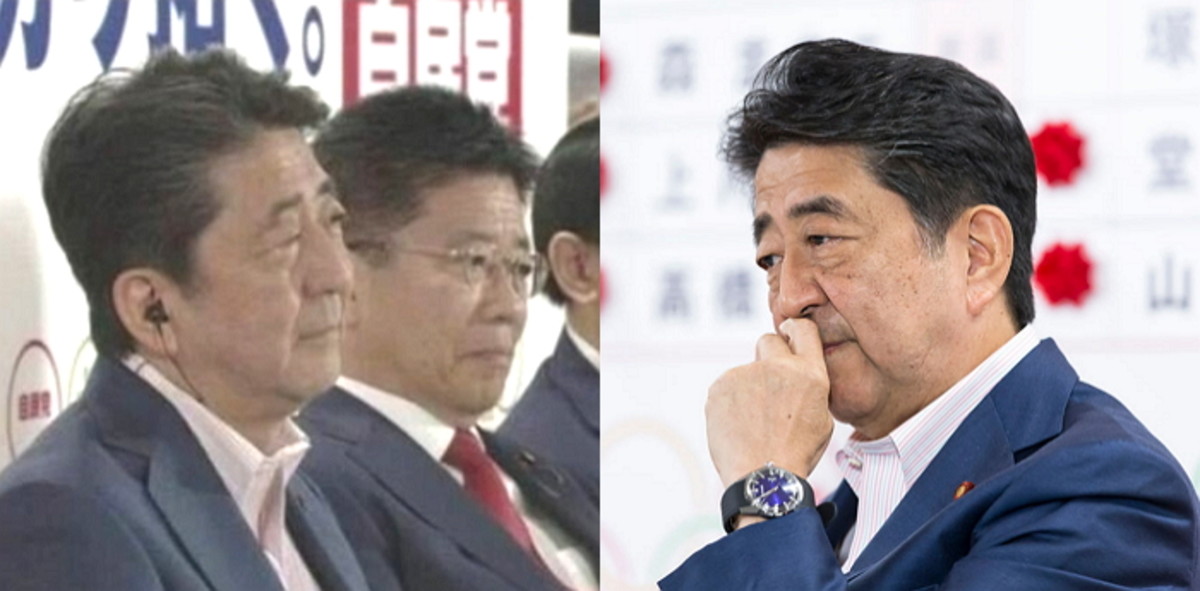 아베는 2016년 선거 승리 때와는 180도 다른 표정으로 개표를 지켜봤다.