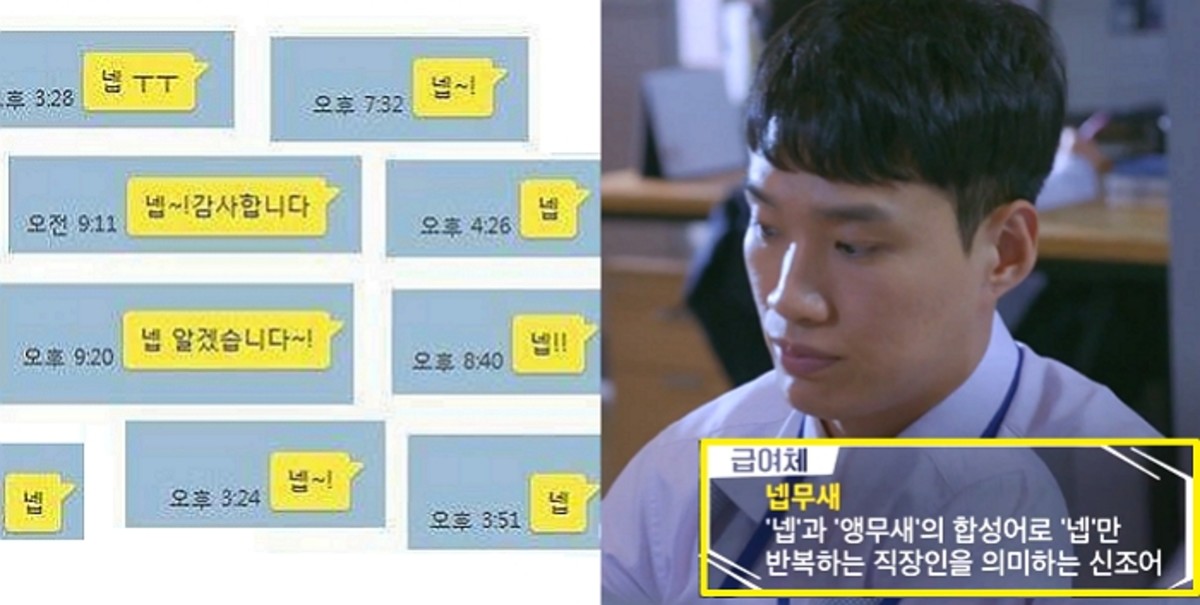 이처럼 '넵'이라는 대답을 반복하는 직장인들 때문에 최근에는 '넵무새'(넵+앵무새)라는 신조어까지 유행하고 있다.