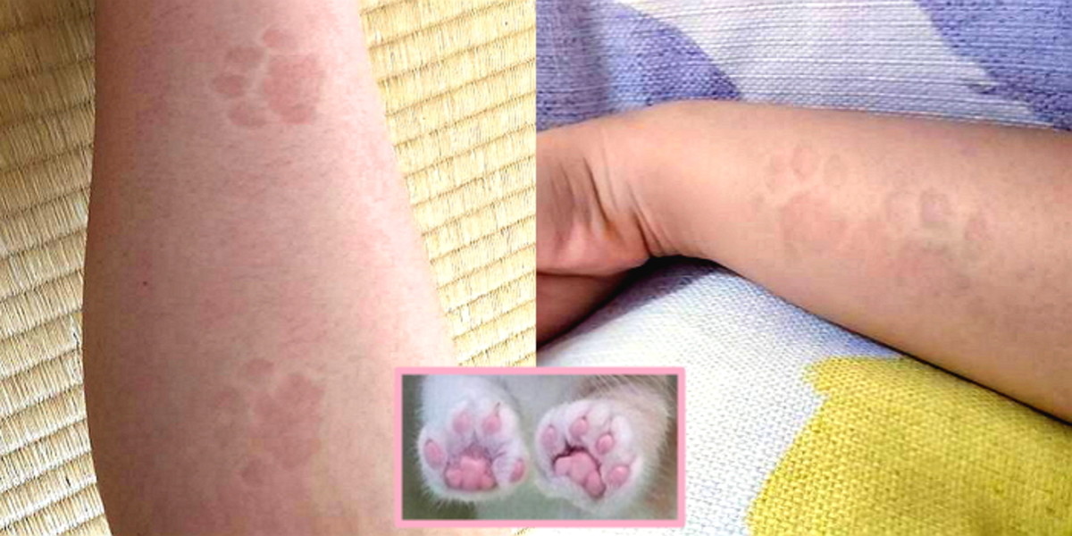 사진 속에는 팔뚝 위로 앙증맞은 동그라미 다섯 개로 이루어진 고양이 발바닥 자국이 그대로 남아있는 모습이 담겨있다.
