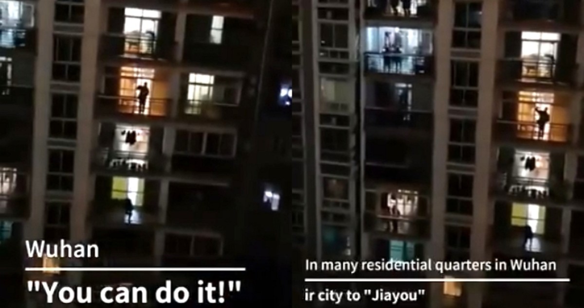 해당 영상에는 우한시에 위치한 한 아파트 단지의 모습이 담겼는데 아파트 주민들은 창문에 얼굴을 내밀고 큰 소리로 "짜요(加油)"를 외치고 있다.