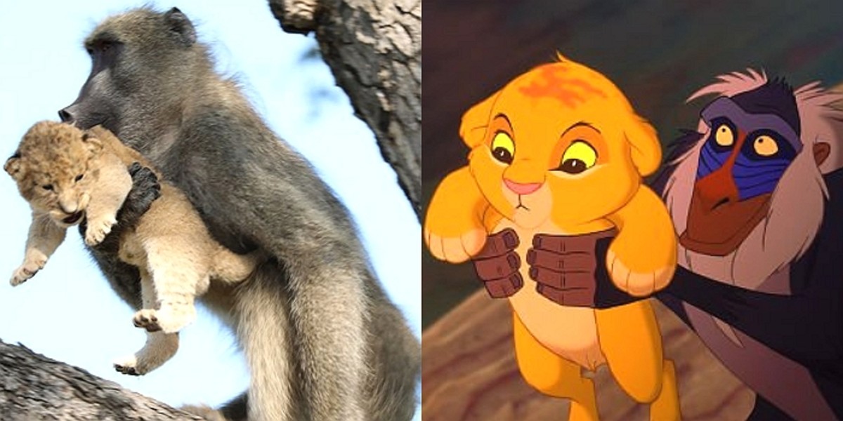 그런데 이 장면은 마치 디즈니 만화 라이온킹 속, 새끼 사자 '심바'를 품은 개코원숭이 '라피키'의 모습을 연상하게 했다.