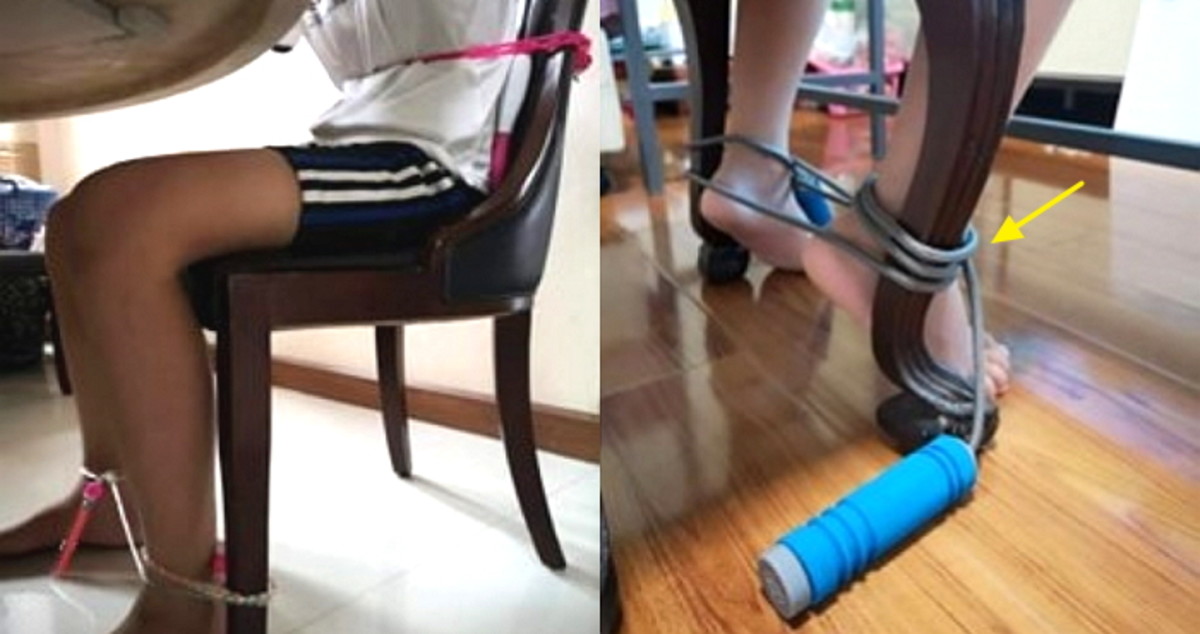 익명의 누리꾼들이 올린 사진에는 온라인 수업에 집중을 하지 않는 아들을 줄넘기 등을 이용해 의자에 꽁꽁 묶어둔 모습이다.