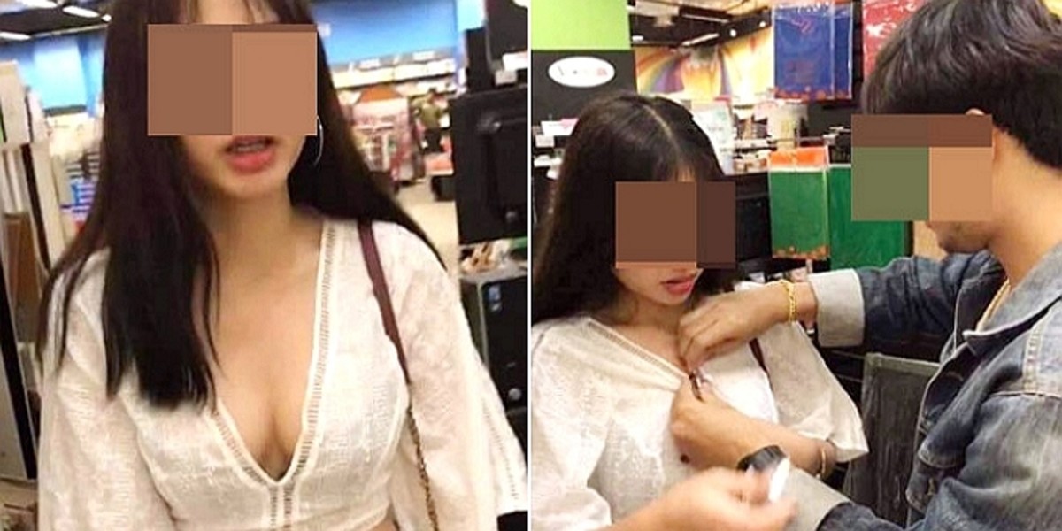 가슴골이 훤히 드러나 보이는 모습에 그는 주변에서 고정할 수 있는 핀을 찾아 여자친구의 옷을 억지로 여며버렸다.