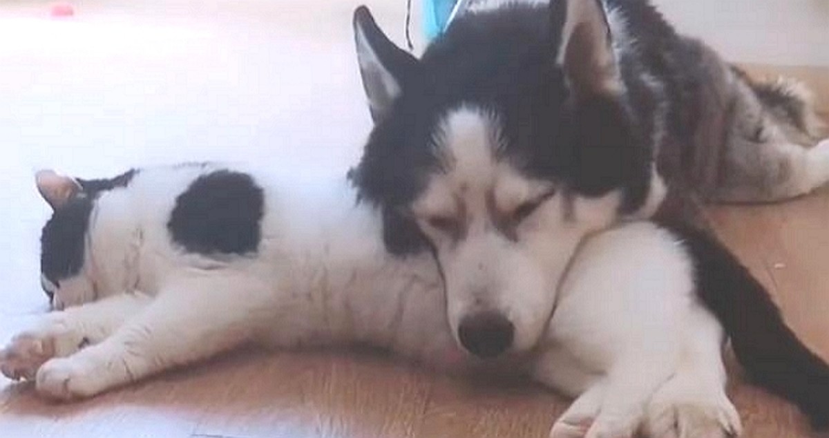 당시 고양이는 인간에게 상처를 받아 마음의 문을 열지 못했고, 심각하게 불안한 증세를 보였다. 허스키는 자꾸만 몸을 벌벌 떠는 고양이가 걱정됐는지 계속 녀석의 옆을 지키며 보호해줬다.