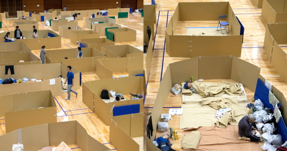 이 가운데 일본 야츠시로 시는 대피소로 지정된 체육관의 수용인원을 줄이고 일정 간격을 유지하기 위해 '골판지 가림막'을 설치해 이재민들에게 제공했다.
