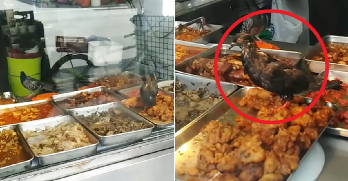 영상 속에는 비둘기 두 마리가 가판대로 날아오더니 한 마리는 후라이드 치킨 위에, 그리고 또 다른 한 마리는 양념치킨 옆에 자리를 잡았다.