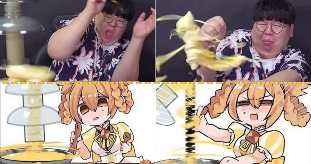 한 누리꾼은 애니메이션 프리큐어 팬아트로 치즈 분수를 표현했다. 회오리치는 치즈 앞에서 당황하는 소녀의 표정이 리얼하게 표현됐다.