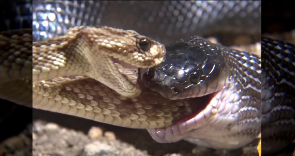 새끼 방울뱀과 커다란 무수라나(Mussurana)뱀이 서로 맞붙었다. 무수라나뱀은 커다란 덩치를 이용해 순식간에 방울뱀의 몸을 감쌌다.