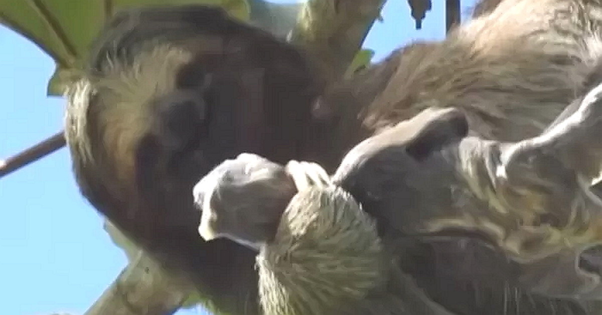 나무늘보는 빠른 몸동작으로 새끼를 안정적으로 붙잡고 품으로 끌어당겼다.