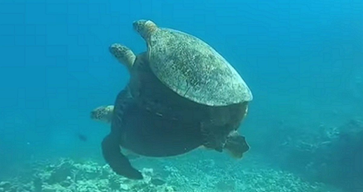 공개된 영상에서는 거북이 세 마리가 서로의 등에 딱 붙어 마치 한 몸이 된 마냥 바닷속을 유유히 헤엄치고 있다.