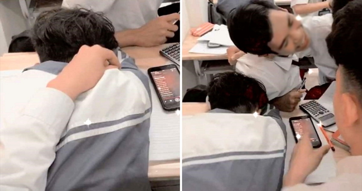 공개된 사진에는 실연의 아픔에 몸부림치며 책상에 엎드려 눈물을 흘리는 남학생의 모습이 담겼다.
