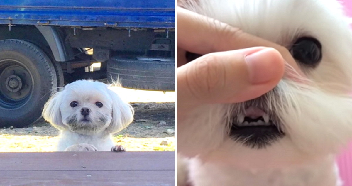 견주는 재롱이의 윗입술을 살짝 밀어 올렸다. 그러자 위쪽 앞니가 모두 빠져 핑크색의 잇몸이 훤히 드러났다.
