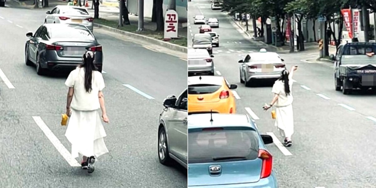 [인사이트] 김재유 기자 = 왕복 8차선 도로 한 가운데서 차들 사이를 유유히 걷고 있는 여성의 모습이 포착돼 충격을 안기고 있다.