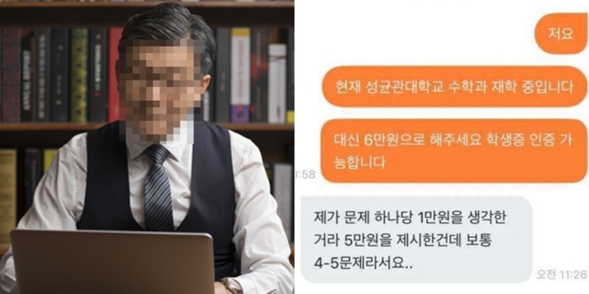 B씨는 본인이 성균관대학교 수학과에 재학 중인 대신 '6만 원'으로 해달라며 흥정을 시도했다. 학생증 인증도 가능하다고 덧붙였다.
