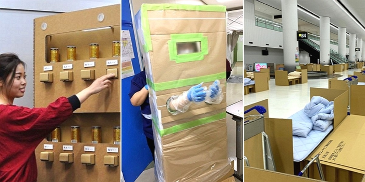 이뿐만이 아니다. 코로나의 확산을 막기 위해 은행 창구에 설치된 가림막 역시 투명필름이 붙여진 골판지였으며 지진으로 인한 대피소와 음료를 뽑아 마시는 자판기까지 골판지로 만들었다.