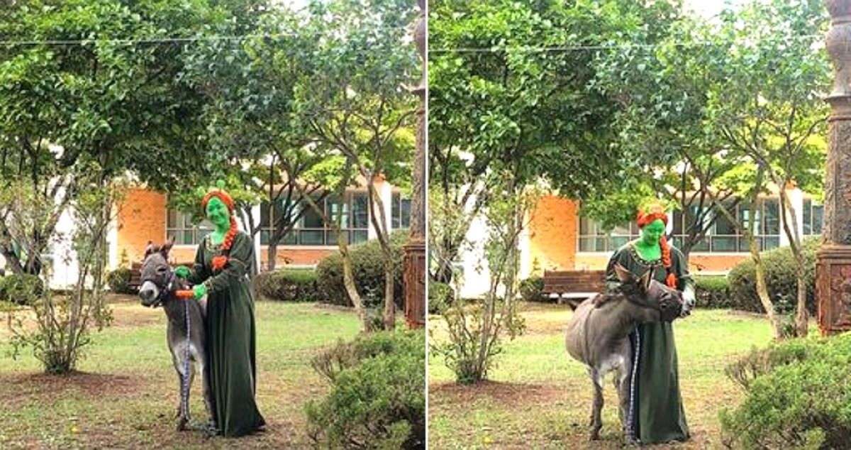 멀리서 찍힌 듯한 사진 속에는 영화 '슈렉' 속 피오나 공주와 당나귀 동키가 다정한 모습으로 포즈를 취하고 있다. 동키의 익살스러운 표정까지 살아있다.