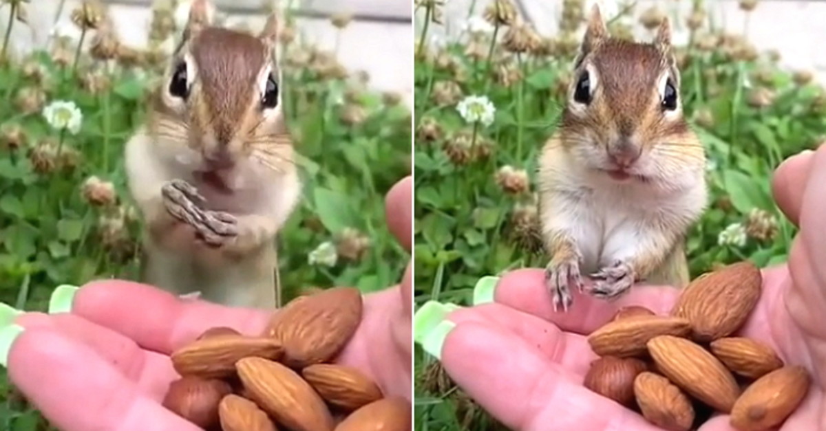 영상에는 사람이 건넨 아몬드를 급하게 집어 입에 넣고 있는 다람쥐의 모습이 담겼다.