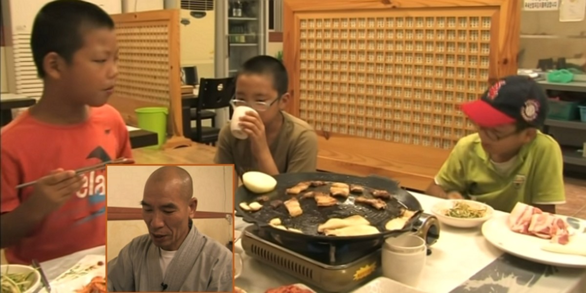 밥을 먹던 스님은 인터뷰에서 "둘째는 나를 닮아 입맛이 까다로워 고기를 잘 먹지 않는다"고 말했다. 첫째와 막내는 아랑곳하지 않고 불판 앞에 구워지는 고기를 맛있게 먹었다.