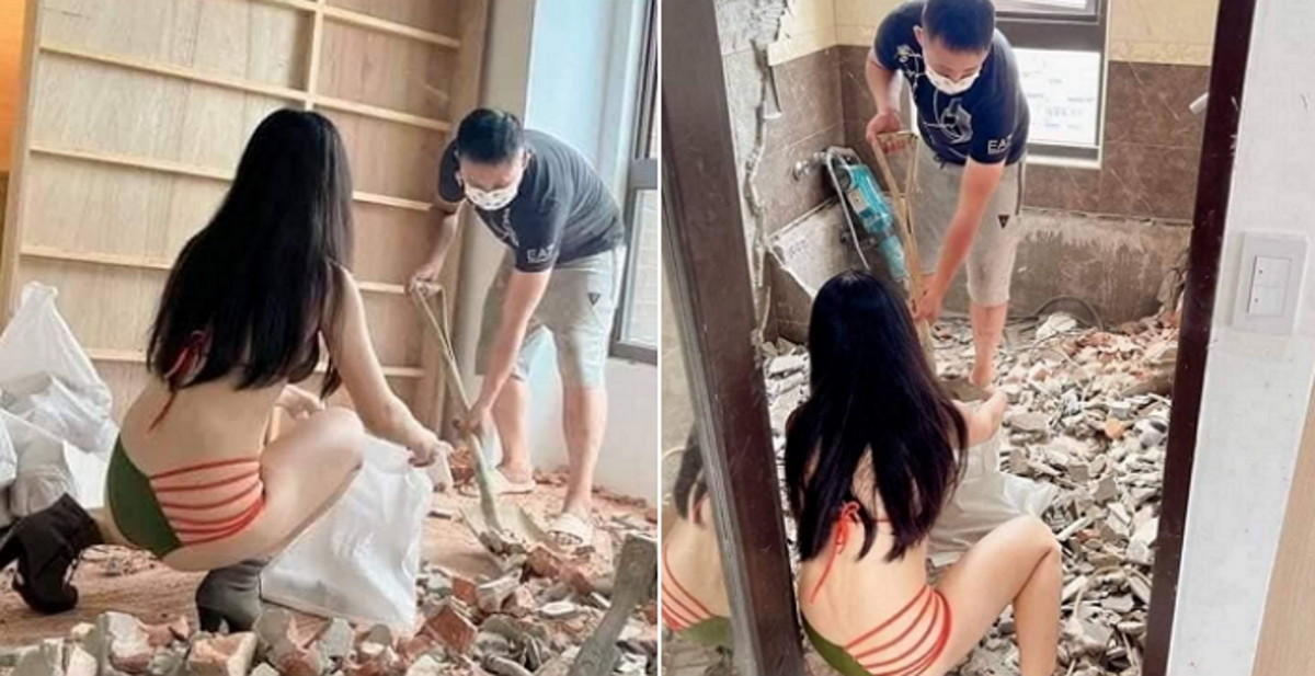 이때 여성의 옷차림이 눈에 띈다. 그녀는 높은 힐에 비키니를 입고 있다. 공사 현장에서 일을 하기에는 다소 불편해 보이는 옷이다.