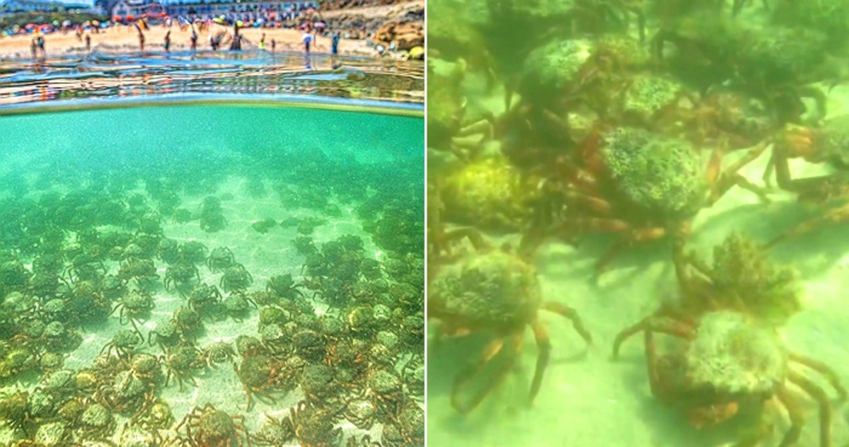 수천 마리에 이르는 거미게들이 깊은 물속으로 들어가기 전 허물을 벗기 위해 콘월 포스 귀 든 해변에 수심 얕은 곳에 나타났다.