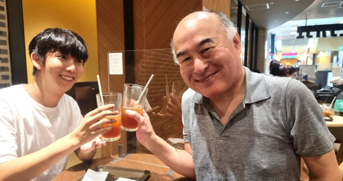 사진 속에는 용짱이가 한 일본 노인과 함께 건배를 하고 있는 모습이 담겼다. 두 사람은 자연스럽게 미소를 보이며 함께 사진을 찍었다.