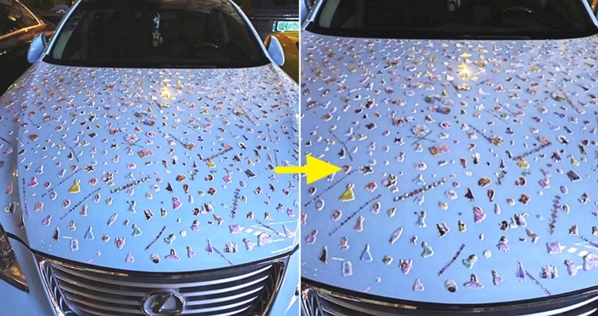 실제 공개된 사진 속에는 새하얀 보닛 위로 화려한 색감의 드레스를 입은 공주 스티커들이 빼곡하게 붙여져 있어 보는 이들을 경악게 한다.