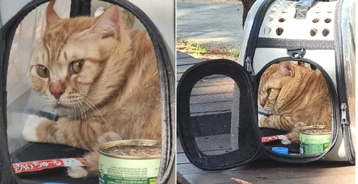 그가 공개한 사진에는 케이지 안에서 몸을 웅크리고 있는 고양이 한 마리와 참치캔, 간식 등이 담겼다.