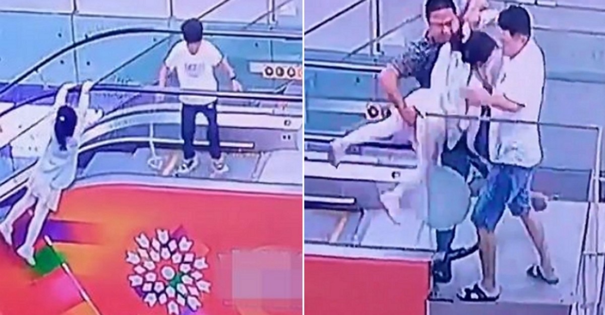 그때 에스컬레이터 난간에 위험천만하게 매달린 소녀를 발견한 한 소년이 주변 어른들에게 도움을 요청했다.