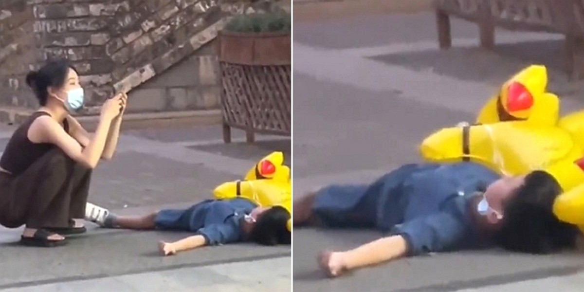 영상에서는 아이스크림 가판대 앞에서 초대형 풍선을 잡고 바닥에 누워있는 어린 소년이 보인다.