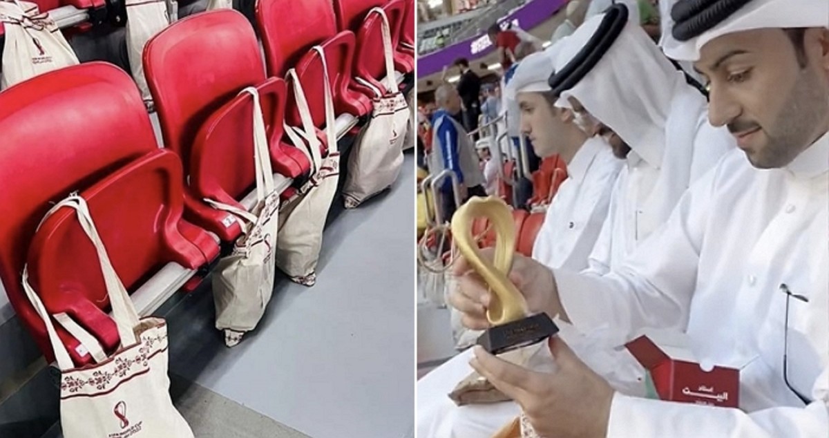 매체가 공개한 사진 속에는 알 베이트 스타디움 좌석 하나 하나에 선물 꾸러미가 담긴 '럭키백'이 나란히 놓여 있는 모습이 담겨 눈길을 끈다.