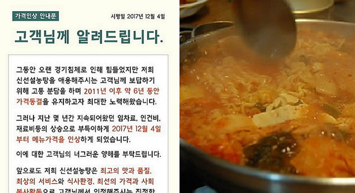 가격을 올린 것은 놀부부대찌개뿐만이 아니다. 신선설농탕도 이달 4일부터 대표 메뉴인 설농탕 가격을 7,000원에서 7,900원으로 약 14% 올렸다.