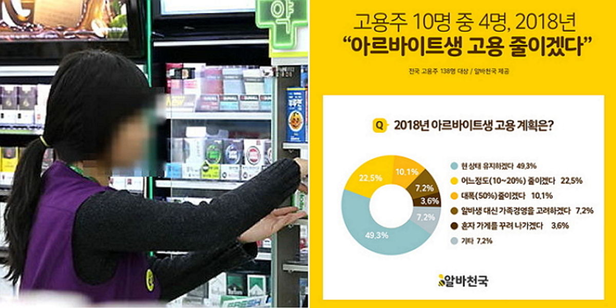 실제로 지난 7월 이후 "아르바이트생 고용을 줄였다"와 "아르바이트생 고용 시간을 줄였다"고 답한 고용주가 각각 23.2%와 17.4%를 기록했다.