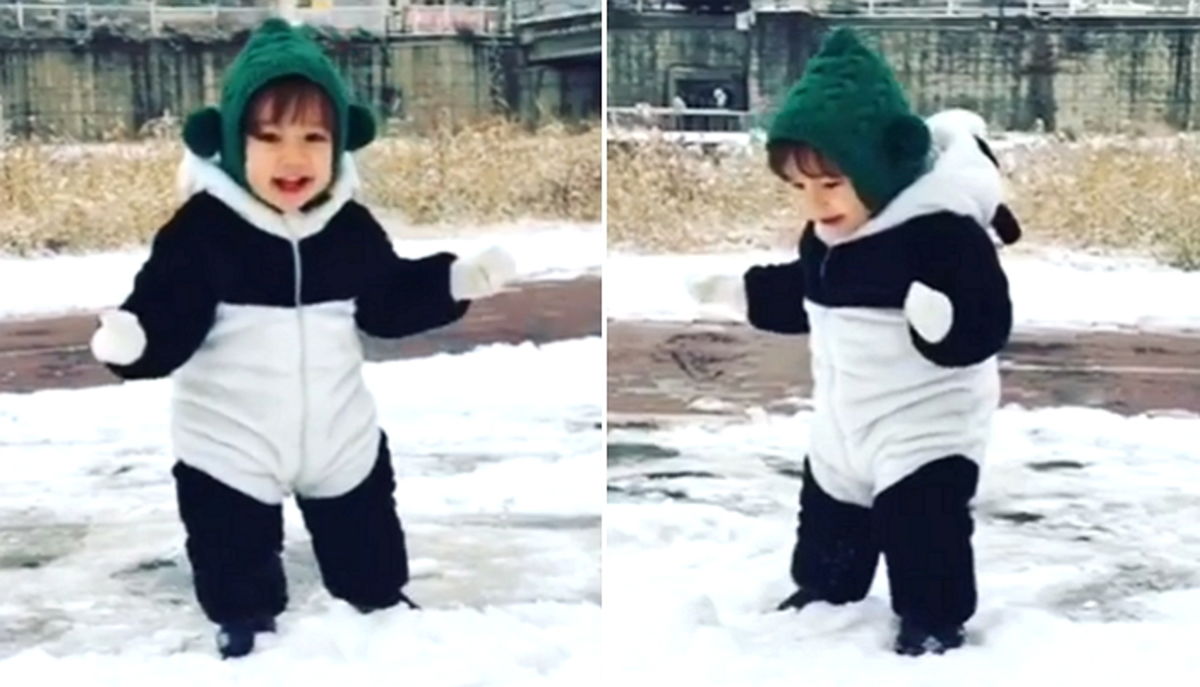 공개된 영상 속에서 레오는 판다 얼굴이 달린 깜찍한 옷을 입고 아장아장 눈 속을 걸으며 올해 첫눈을 온몸으로 즐기고 있다.