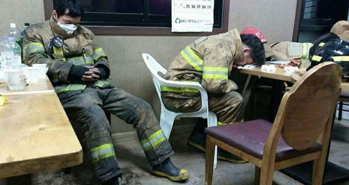 만성적인 인력 부족으로 언제나 1인 3역을 해내야 하는 소방관들은 출동 후에 이처럼 녹초가 된다고 증언한다.