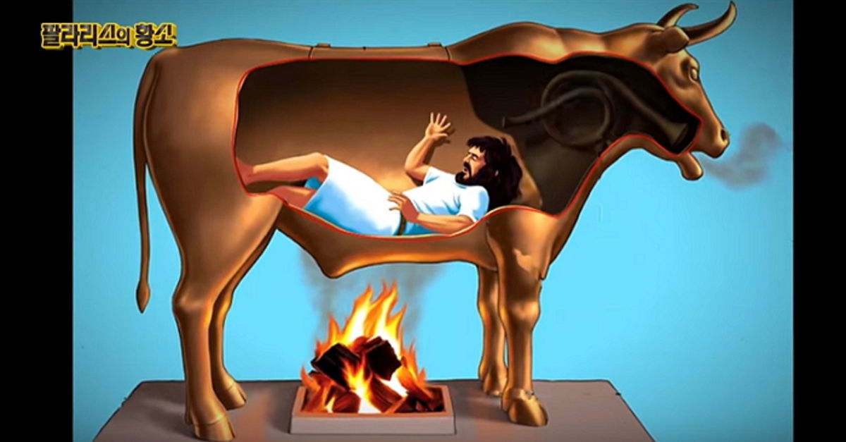 놋쇠 황소를 보고 매우 만족스러웠던 팔라리스 왕은 호탕하게 웃으며 곧바로 첫 희생자를 지목해 실험에 들어갔다.