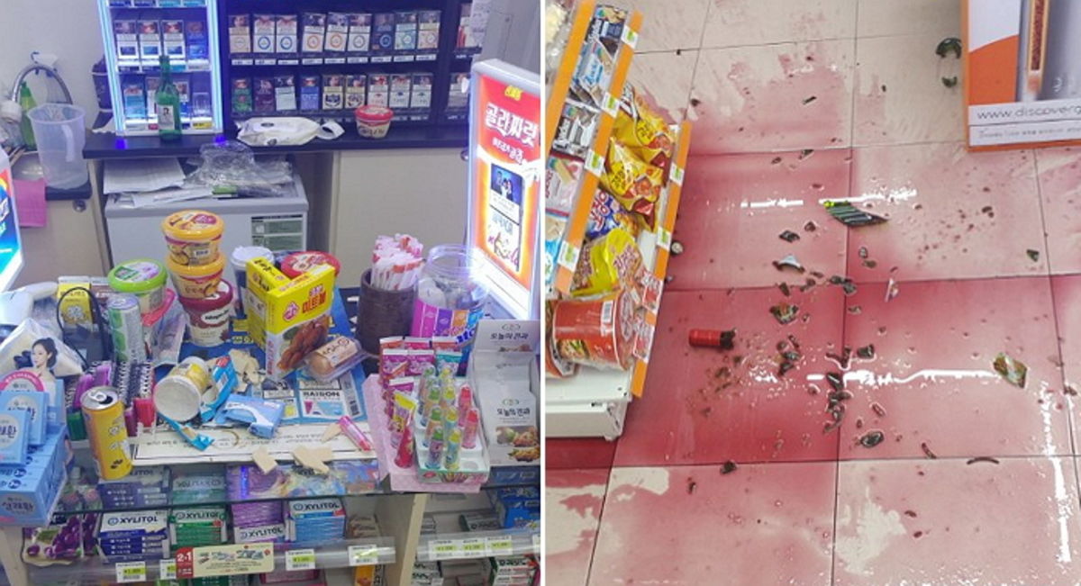 이 글에는 각종 물품이 잔뜩 흩어져 있는 편의점 계산대와 와인병이 깨져 엉망이 된 바닥 사진이 포함돼 있었다.