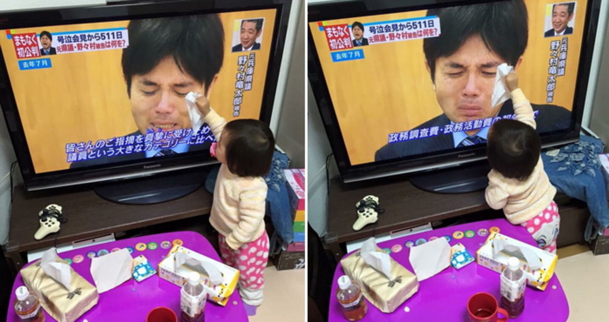 최근 온라인 미디어 네트긱은 TV 속에서 우는 남성의 눈물을 닦아주는 아기의 모습을 공개했다.