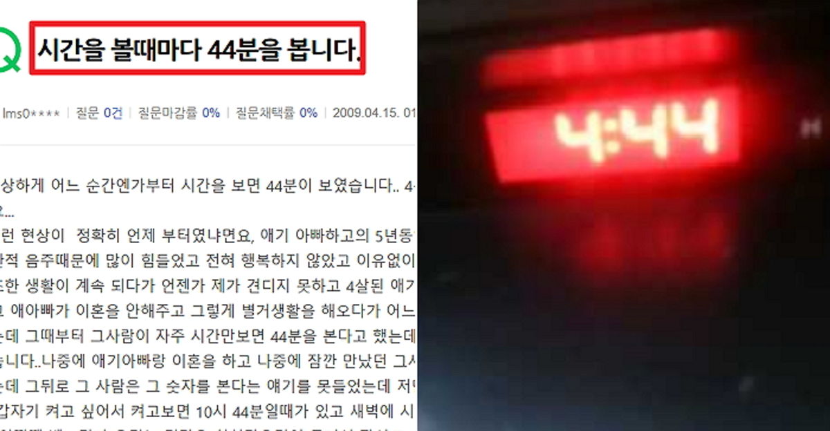 또 "요즘도 44분이 계속 보인다. 누가 좀 도와달라"고 덧붙였다. 작성자는 숫자 4와 얽힌 불길한 일화들을 소개하며 지식인에 조언을 구한 것이다.