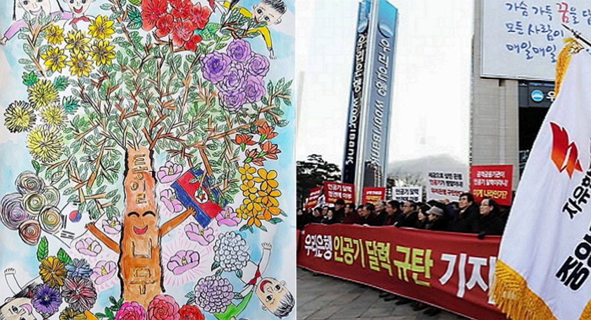 [인사이트] 황기현 기자 = 우리은행이 때아닌 종북 논란을 겪고 있는 가운데, 자유한국당 당원들이 초등학생의 그림 달력을 규탄하기 위해 거리로 나섰다.