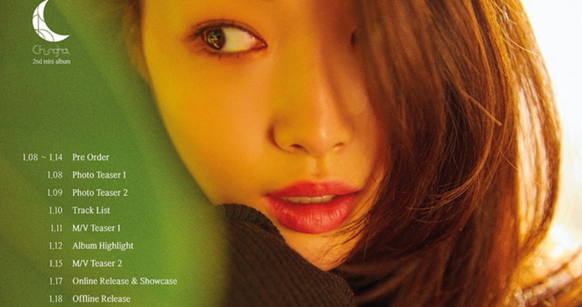 청하의 사진 좌측으로는 앨범 예약 판매 시작일부터 오프라인 음반이 발매되기까지의 전체 프로모션 일정이 담긴 타임테이블이 상세하게 적혀 있다.