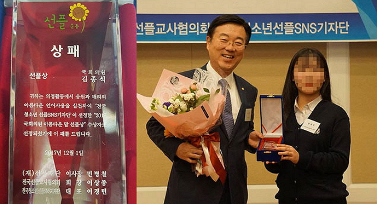 김 의원이 공개한 상패 사진에는 '귀하는 의정활동에서 응원과 배려의 아름다운 언어 사용을 실천하여 전국 청소년 선플 SNS 기자단이 선정한 2017 국회의원 아름다운 말 선플상 수상자로 선정되셨기에 이 상을 드립니다'라고 적혀 있었다.
