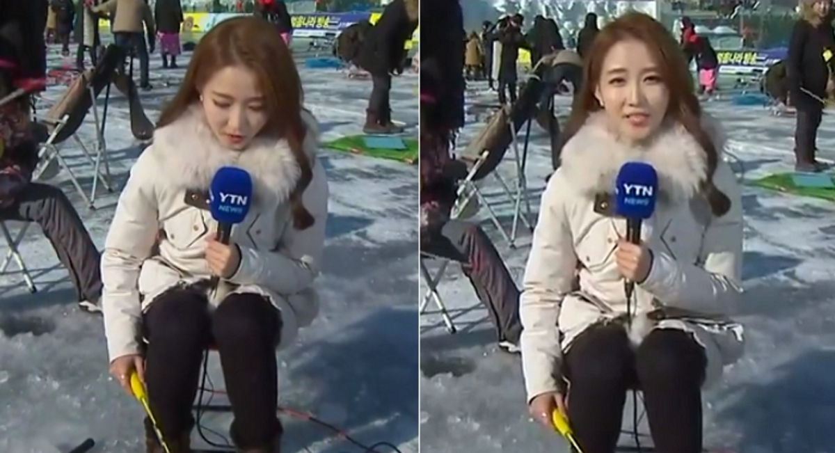 이날 앵커로부터 화면을 넘겨받은 YTN 신미림 기상캐스터는 다른 시민들 사이에서 얼음구멍에 낚싯대를 드리우고 있었다.