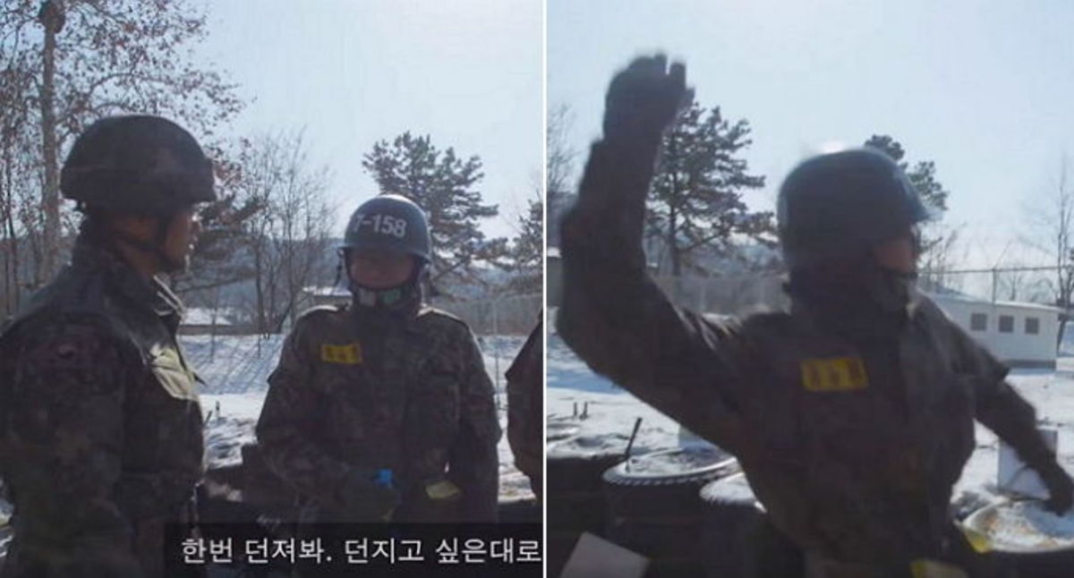 영상에는 어색하고 경직된 모습으로 연습용 수류탄 투척을 연습하는 훈련병들의 모습이 보였다.