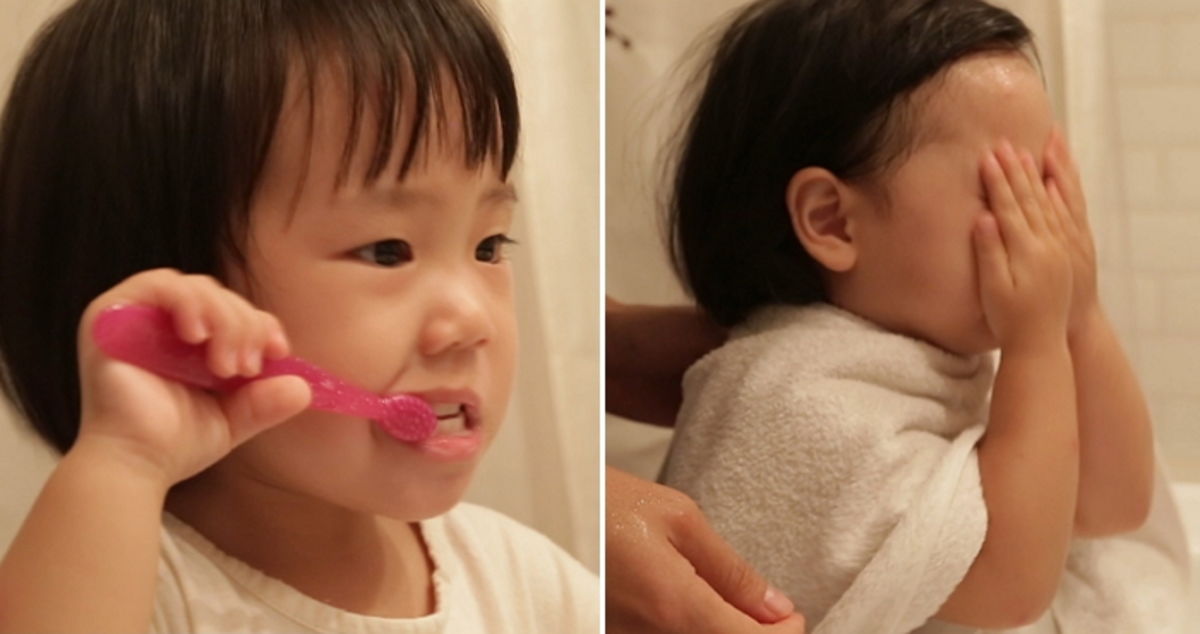 양치를 끝낸 로희는 곧이어 작은 두 손에 물을 받아 얼굴을 씻기 시작한다. '어푸어푸'를 하며 두 손으로 얼굴을 가린 로희는 깜찍하기 그지없다.
