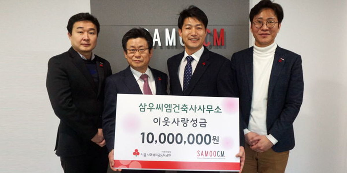 삼우씨엠은 결식아동, 독거노인, 저소득 장애인 등 불우한 소외계층 지원을 위한 이웃돕기성금 1천만원을 '사랑의열매' 서울 사회복지공동모금회에 전달했다고 밝혔다.